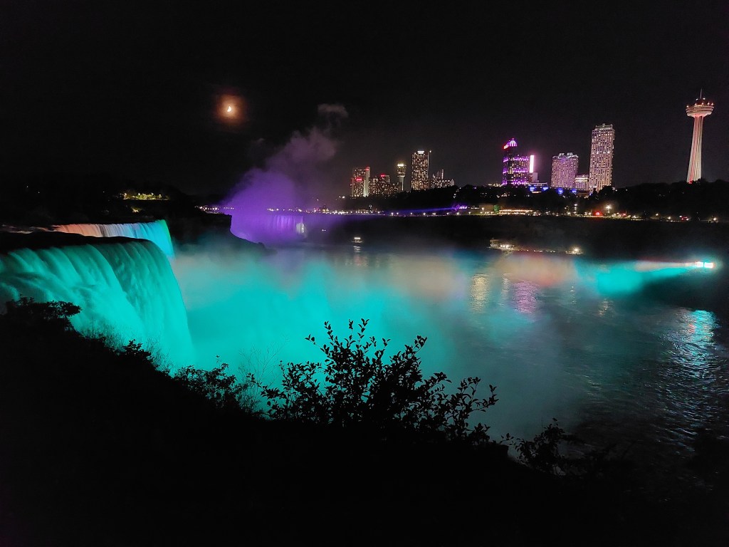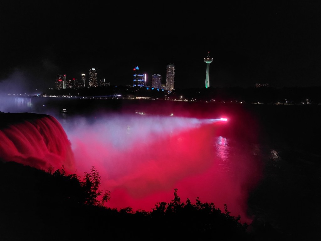 Il est difficile d’imaginer un spectacle plus féerique que celui des Chutes du Niagara illuminées la nuit. C’est ainsi que nous avons fait leur découverte : de nuit, sous un ciel étoilé. Les projecteurs colorés transforment les cascades en nuances de rouge, bleu, vert et violet. Ce qui est surprenant, c’est que dans l’obscurité, tu perds la perception de l’immensité des chutes, ce qui rend la découverte de jour encore plus impressionnante. Les illuminations nocturnes ajoutent une touche de mystère à ce site déjà dingue !